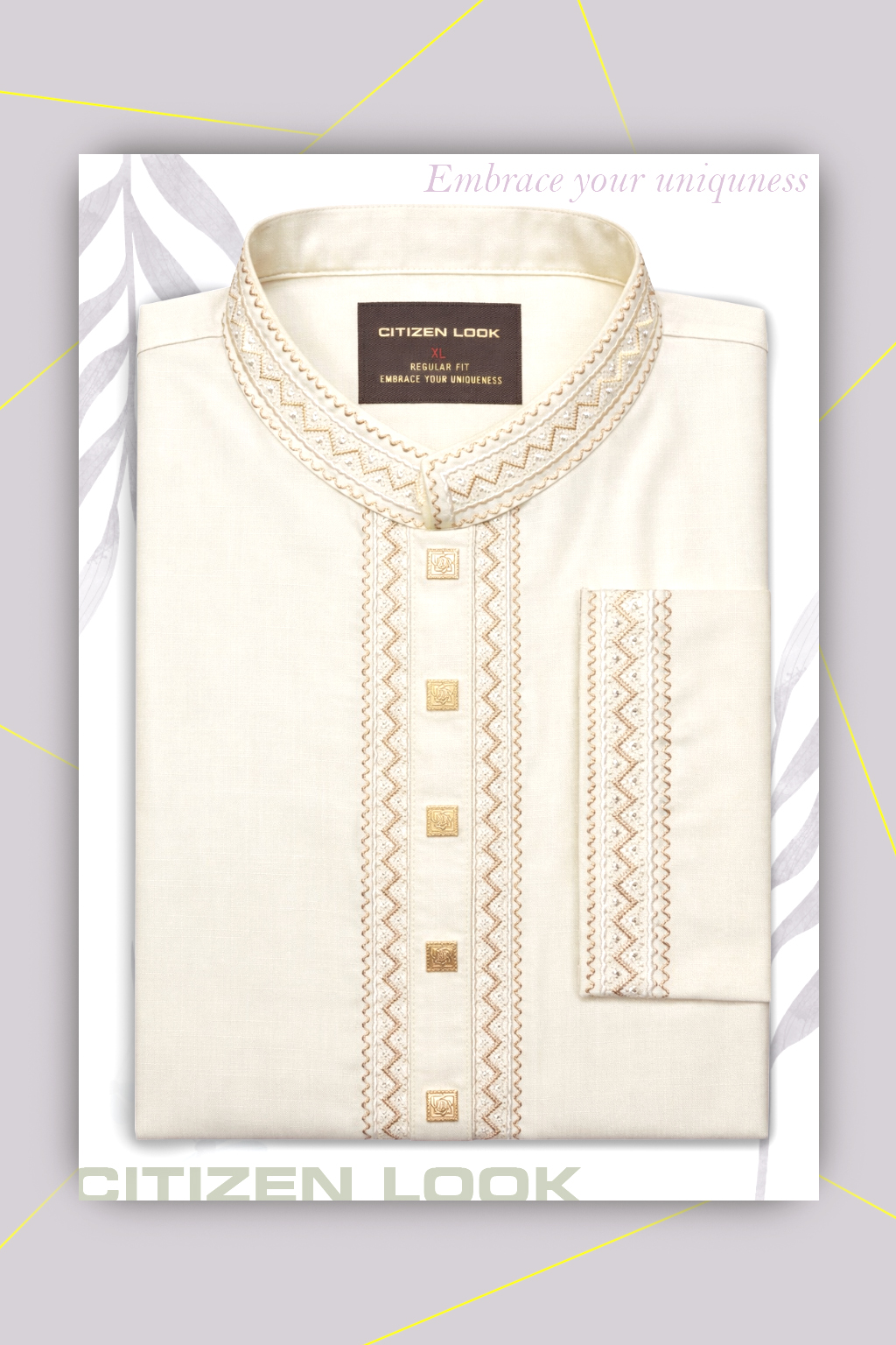 Finished with subtle geometric embroidery on the collar and cuffs.