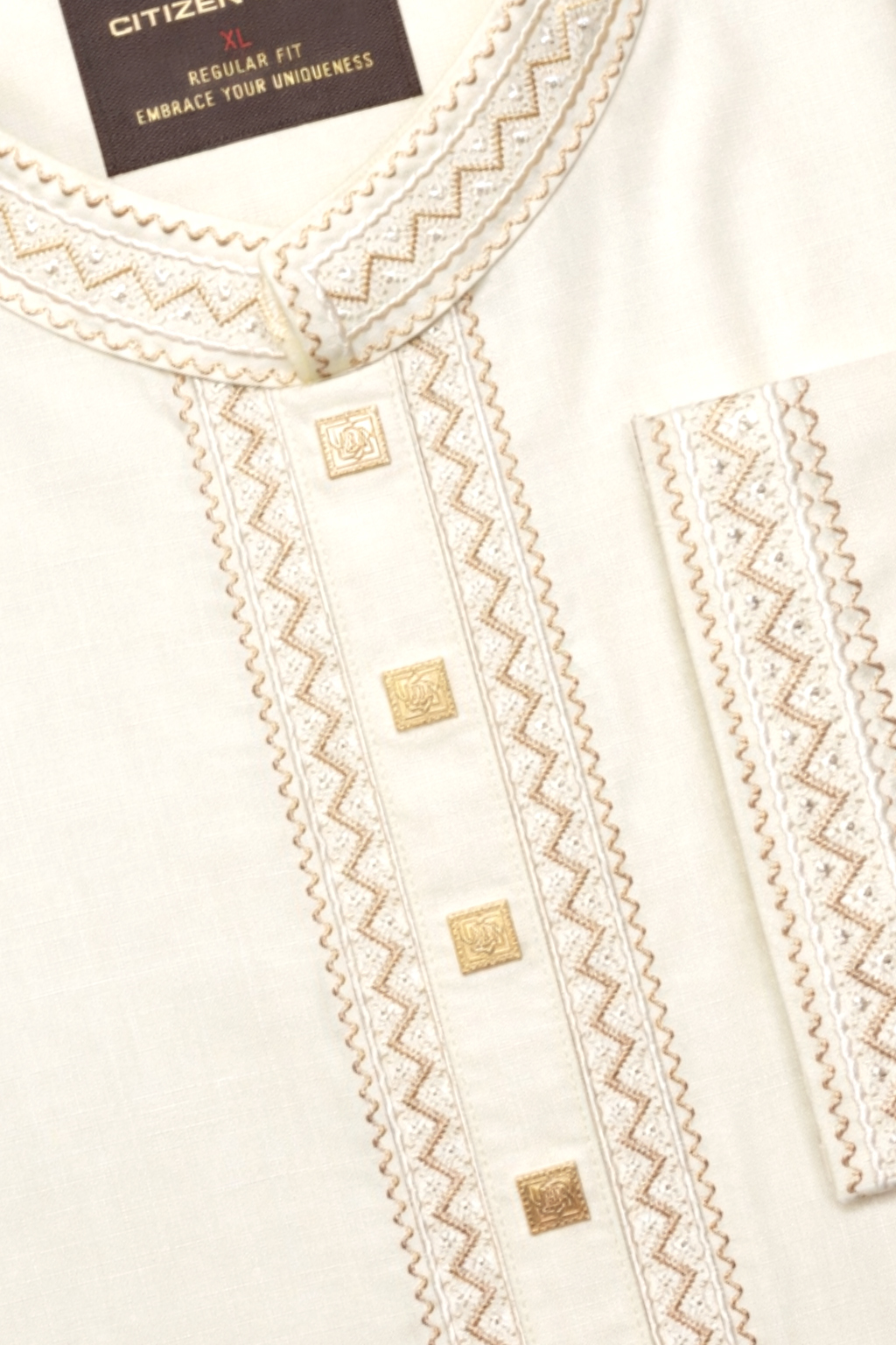 Intricate multicolor embroidery on the collar and sleeve cuffs brings a touch of traditional craftsmanship.